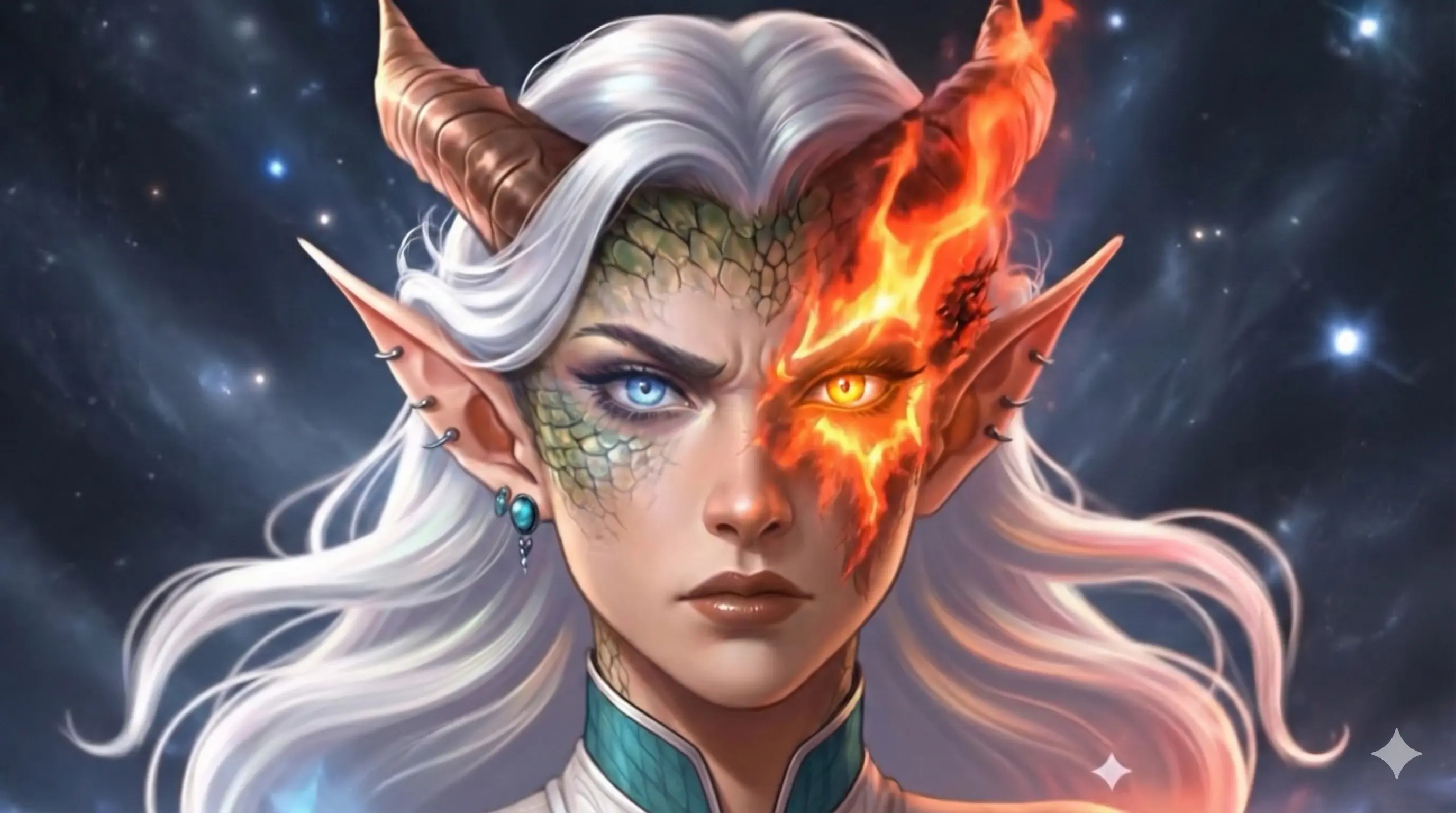 - Horns, tail, scales, draconic might, dragonfire