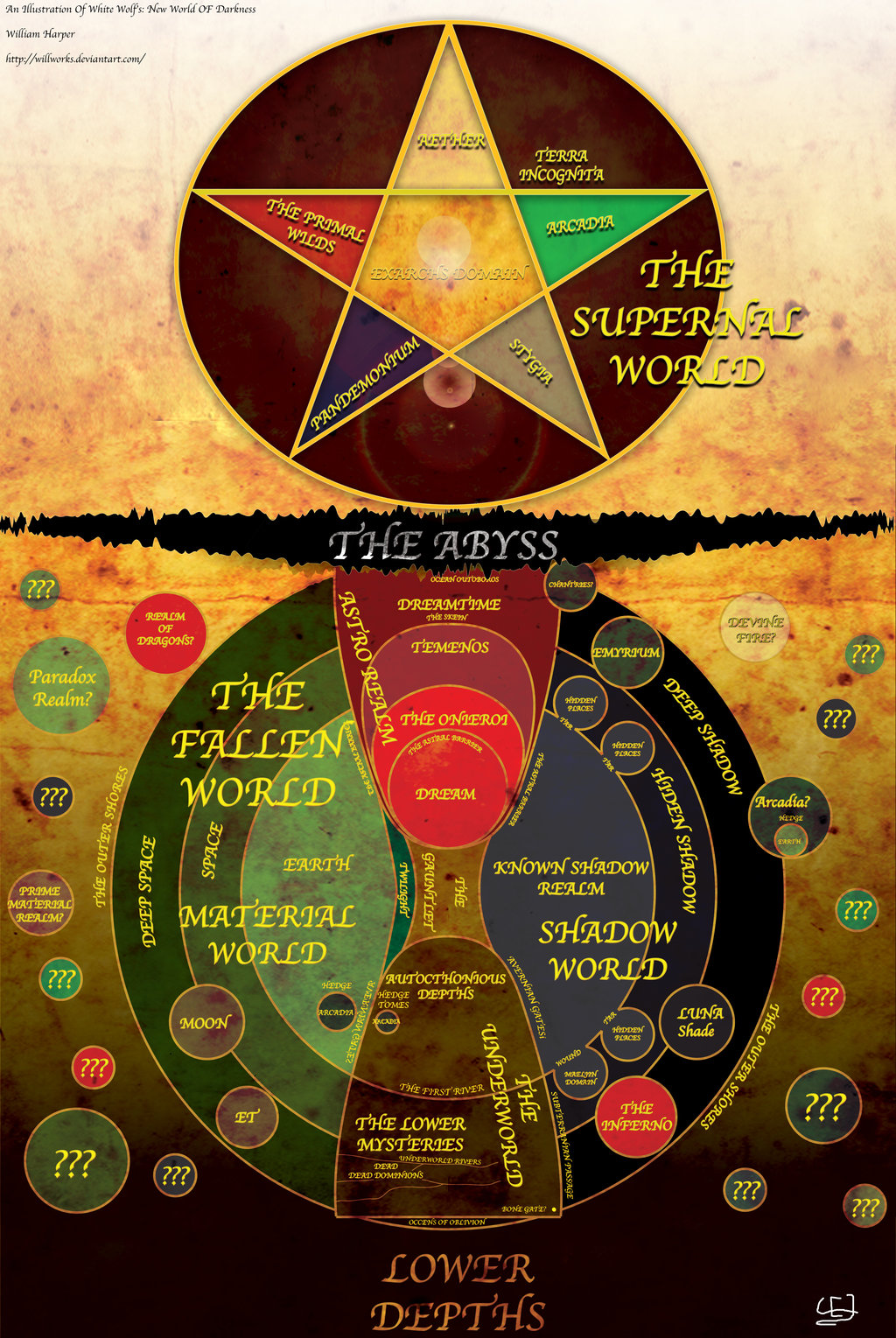 *The Abyss: The Abyss is a kind of null-void that lies between the Material Realm and the Supernal Realm. It's a spiritual-conceptual vacuum, and it produces... snippets of unreality. They're called Abyssal Entities (Intruders when they reach the Material Plane), and can range from everything fairly traditional Lovecraftian horrors or cunning demons, to entire twisted dimensions or pieces of anti-physics and anti-history that degrade reality by their very presence. The general mark of Abyssal horrors is that they try to destroy.