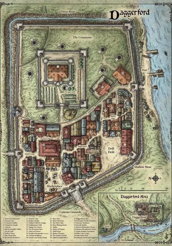 Situated upon the flood plains of the River Delimbiyr and built against the side of a low hill, Daggerford is a small, walled community dominated by the small castle of the local duke. The city is strategically located where the Trade Way crosses the Delimbiyr River on the north side of the Kingsbridge.