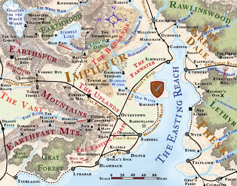 Today, Impiltur consists of all land east of the Earthspur mountains and west of the Easting Reach, bounded on the south by the Sea of Fallen Stars, and on the north by Damara, the Rawlinswood, and the Giantspire Mountains.