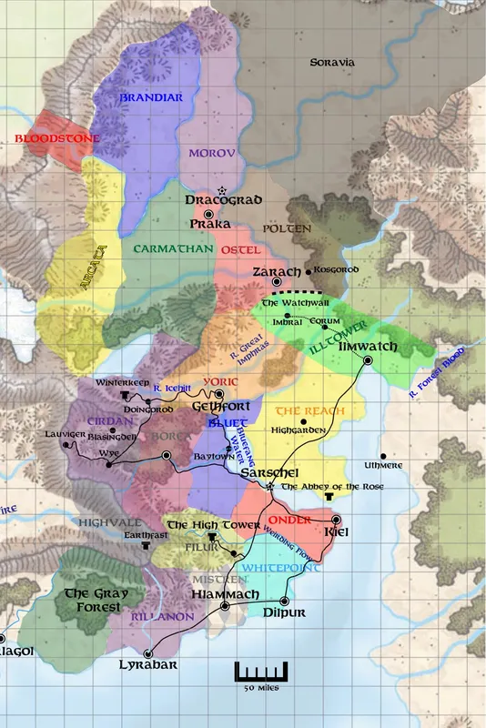 Traditionally, the land is divided into "north" and "south", corresponding to the different sides of the Weirdingflow. "North" connotes many things, including the Cymry and Darmoneii people, the relative newness of advanced construction (castles, roads, cathedarals, etc), the historically lower population, and the perceived warlike nature of its inhabitants. Whereas, "South" connotes the Chessen and Chondathan races, large, mercantile cities, complex government, and the dominance of the Church of the Lords Assembled.